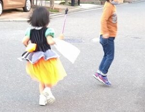 娘にハロウィンする?と聞くと 「絶対する!たのしみー!!」 と乗っかってきてくれたので今年は 本格的に魔女のドレス&家でお菓子を 詰めたやつを近所の友達に配りに行きました。