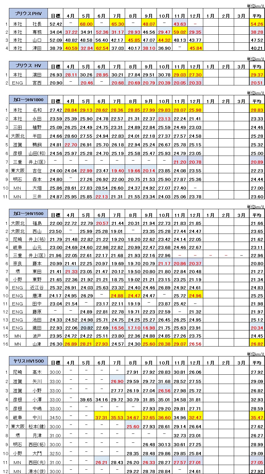 車種別・月別にベスト燃費とワースト燃費を色付けしています。