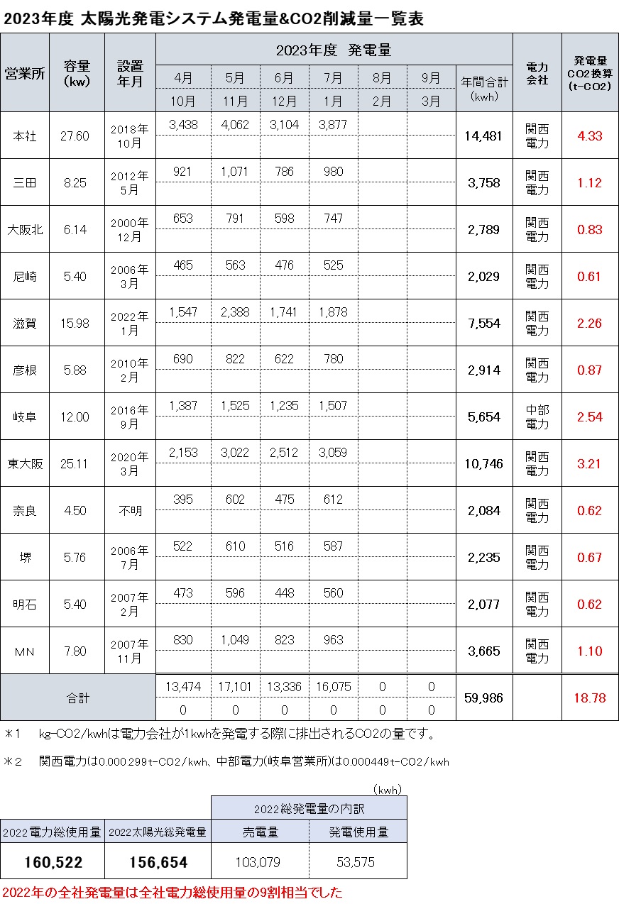 昨年度は全社で年間156,654kwh発電し、CO2換算しますと49,150kg-CO2の削減となりました。