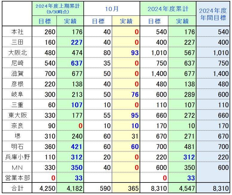 各営業所における実績は下記の通りです。