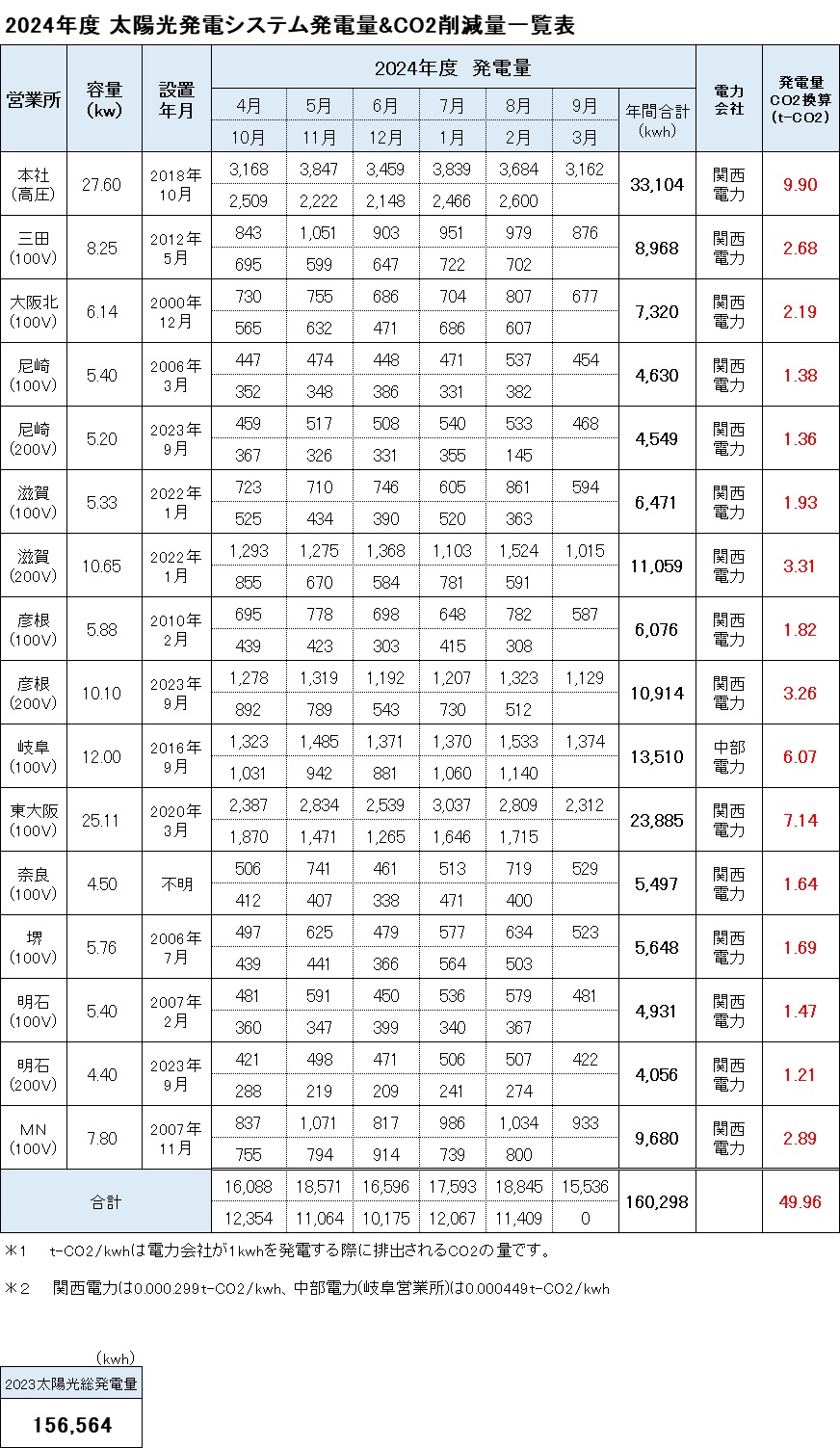 昨年度は全社で年間156,564kwh発電し、CO2換算しますと49.10t-CO2の削減となりました。