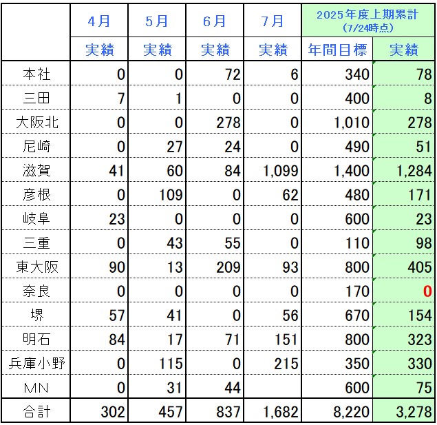 各営業所における実績は下記の通りです。