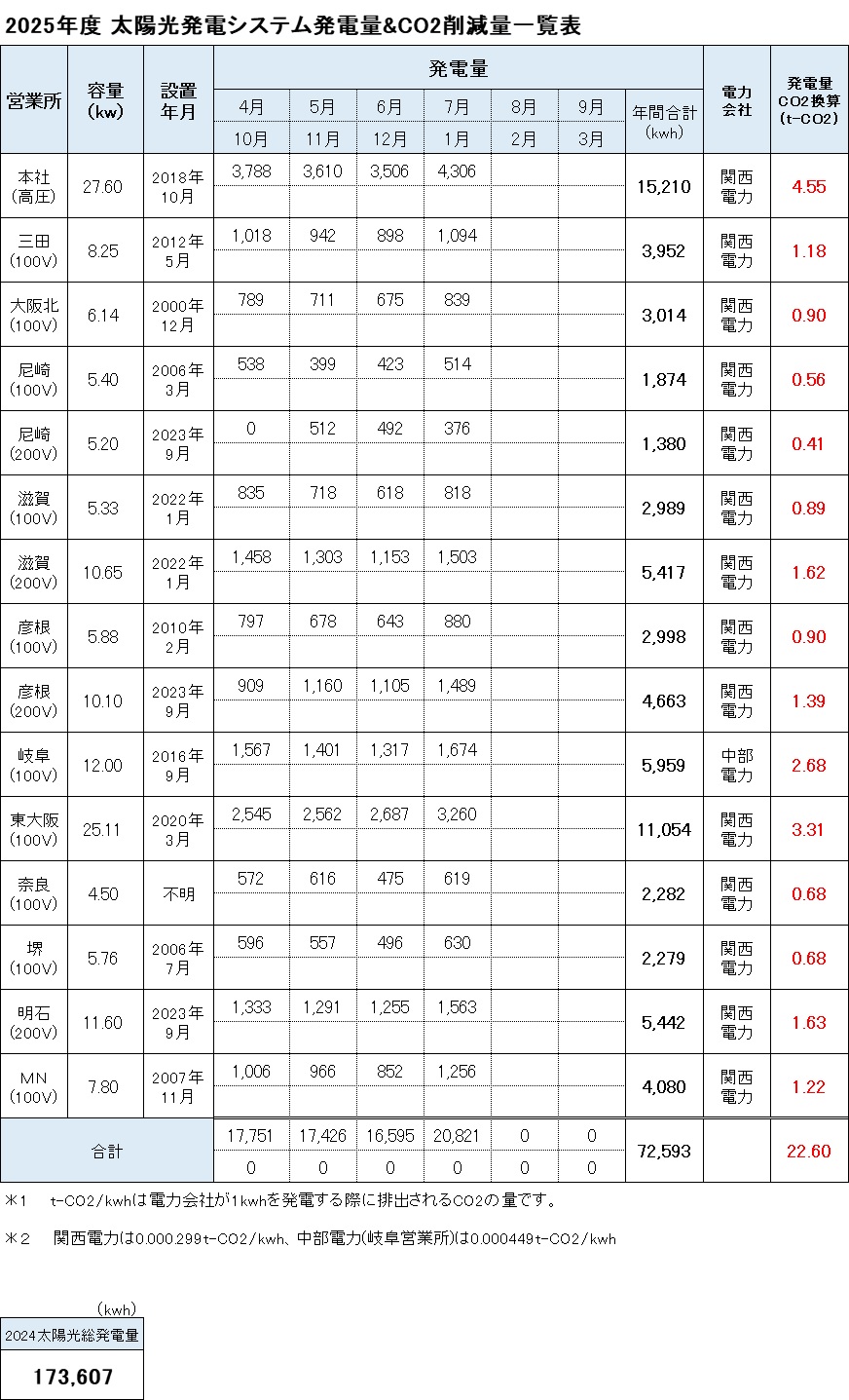 昨年度は全社で年間173,607kwh発電し、CO2換算しますと54.14t-CO2の削減となりました。
