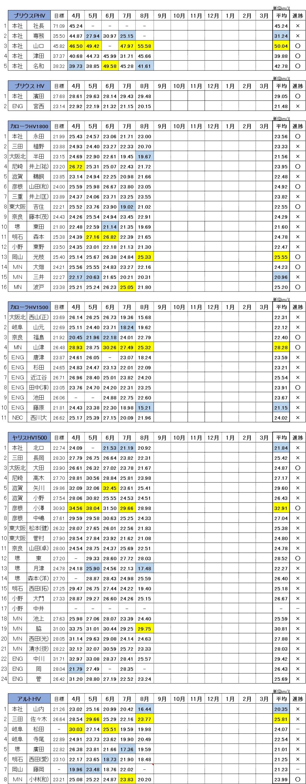 黄色の塗り潰しはベスト燃費、青色の塗り潰しがワースト燃費です。