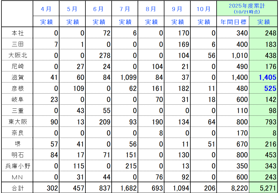 各営業所における実績は下記の通りです。 (単位:kg)※青字は目標達成