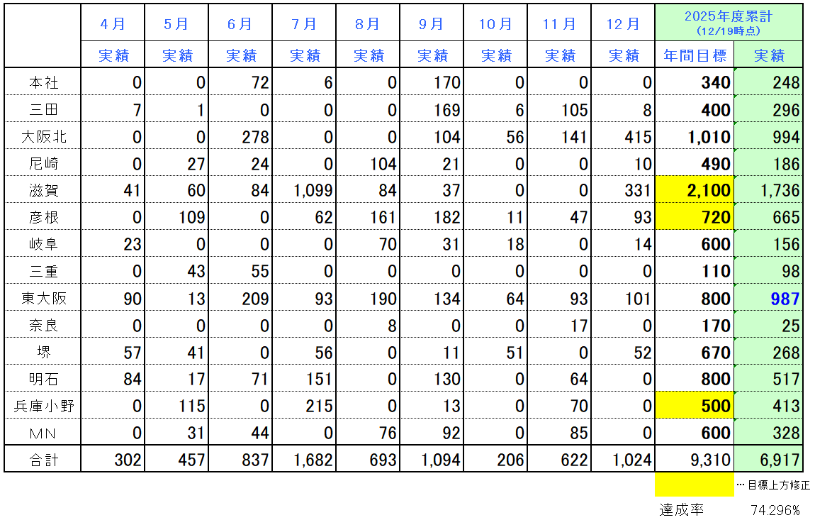 各営業所における実績は下記の通りです。 (単位:kg)※青字は目標達成
