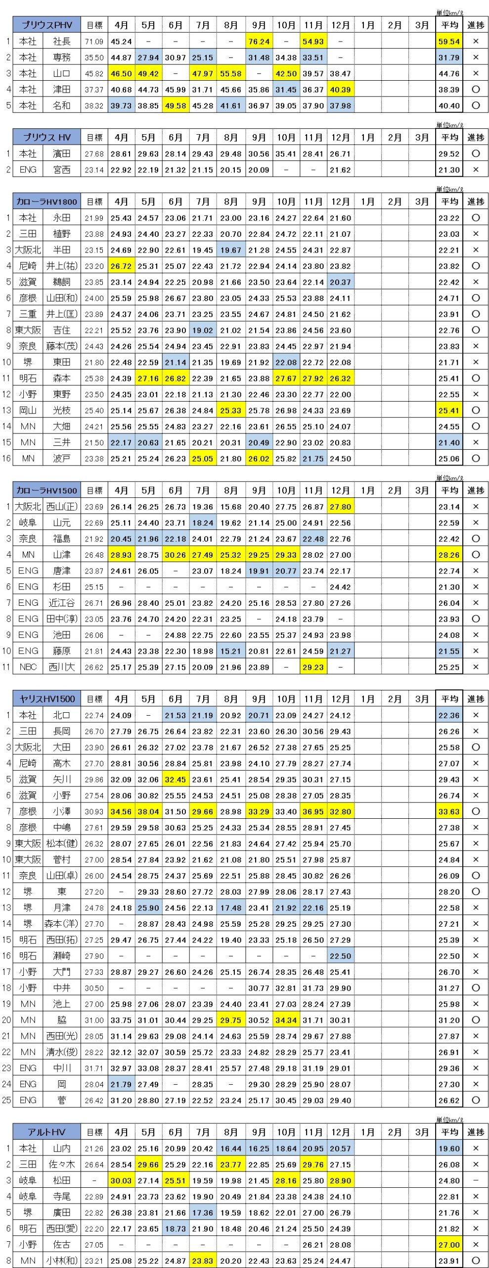 黄色の塗り潰しはベスト燃費、青色の塗り潰しがワースト燃費です。