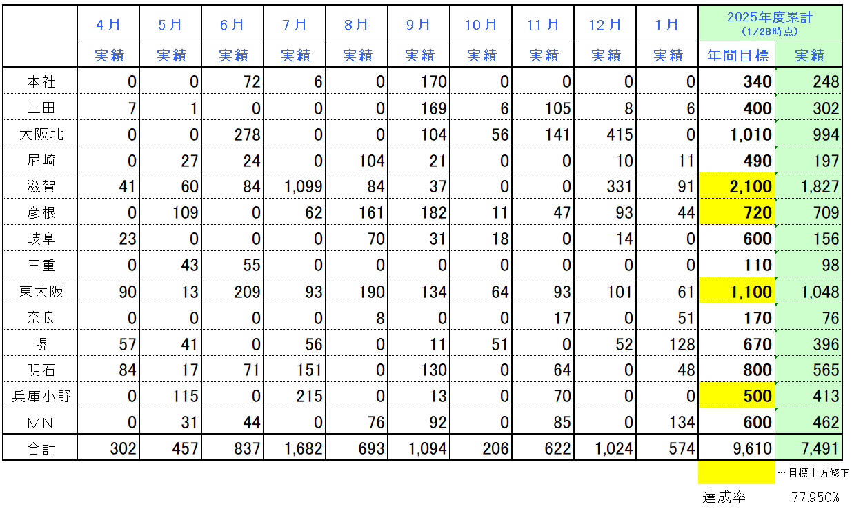 各営業所における実績は下記の通りです。 (単位:kg)※青字は目標達成