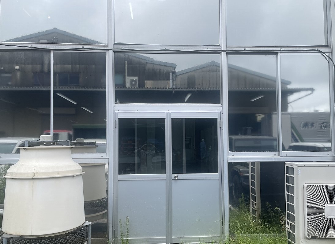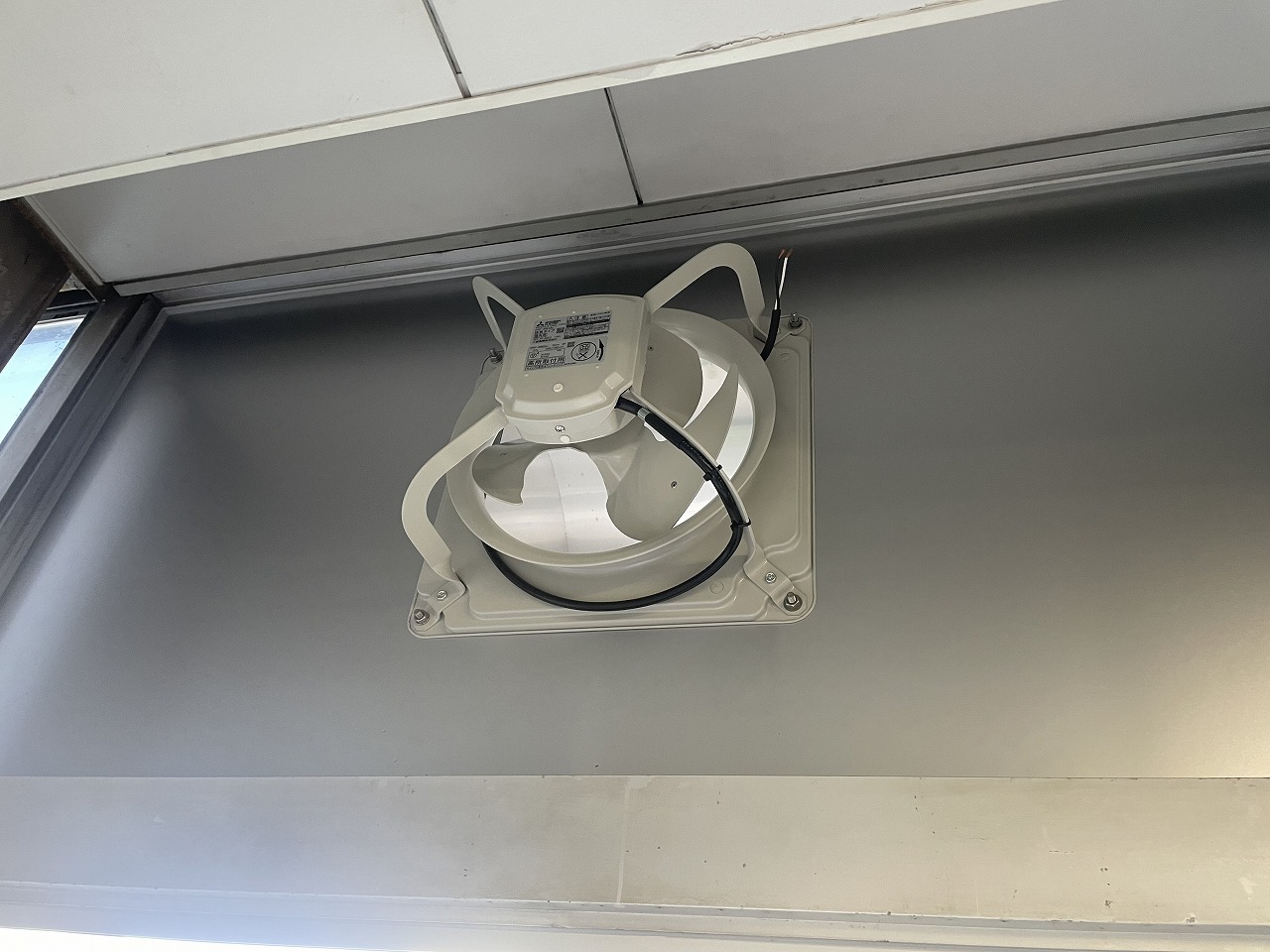 排気問題を解決するため、既設の屋外両開き出入口サッシの欄間に嵌め殺しガラスがあったので、こちらへの取り付けを提案をしました。既設ガラスを撤去し、アルミ複合板を新設設置のうえ、有圧換気扇を取り付ける工事を行いました。