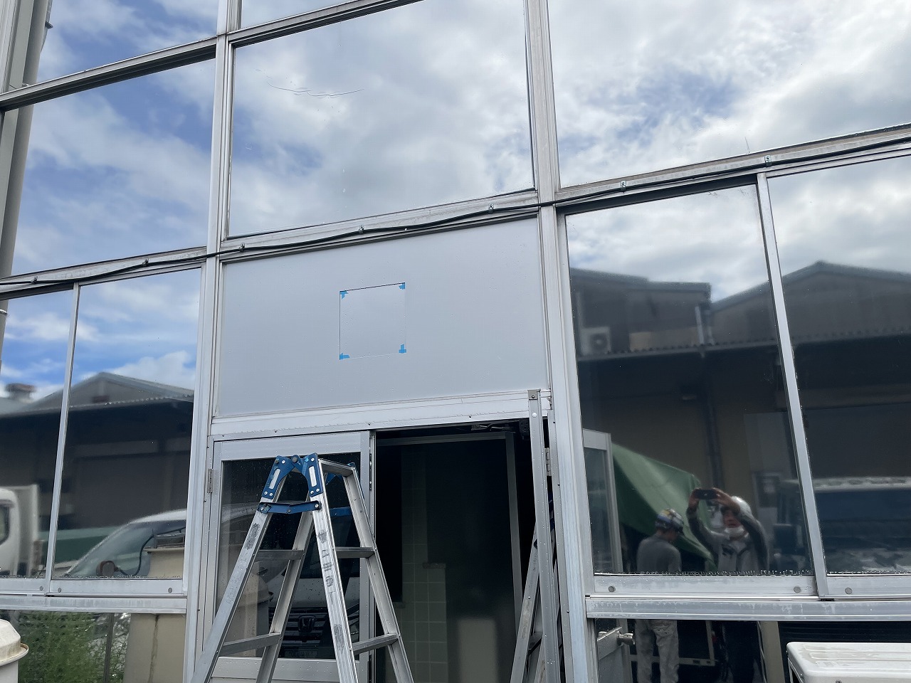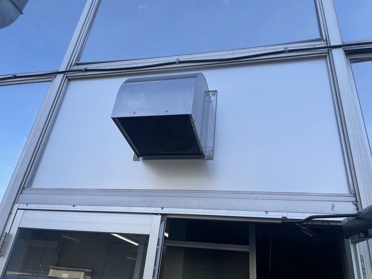 排気問題を解決するため、既設の屋外両開き出入口サッシの欄間に嵌め殺しガラスがあったので、こちらへの取り付けを提案をしました。既設ガラスを撤去し、アルミ複合板を新設設置のうえ、有圧換気扇を取り付ける工事を行いました。