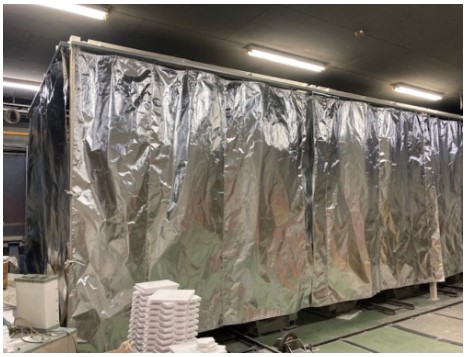 施工箇所付近では、平常時はフォークリフトが頻繁に稼働・通行しており、作業場近辺への立ち入りが困難な状況でした。そのため、お客様からのご依頼により工場休業日に施工を実施し、作業はスムーズに進められました。遮熱シートは、機器の発熱部に沿ってカーテン状に設置し、必要箇所を丁寧に覆う形で施工いたしました。作業場周囲の片付けもお客様のご協力を得て迅速に対応しました。