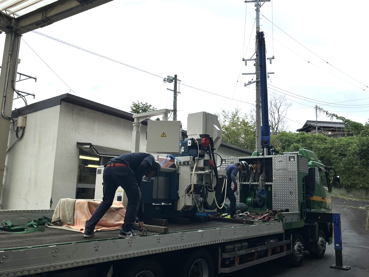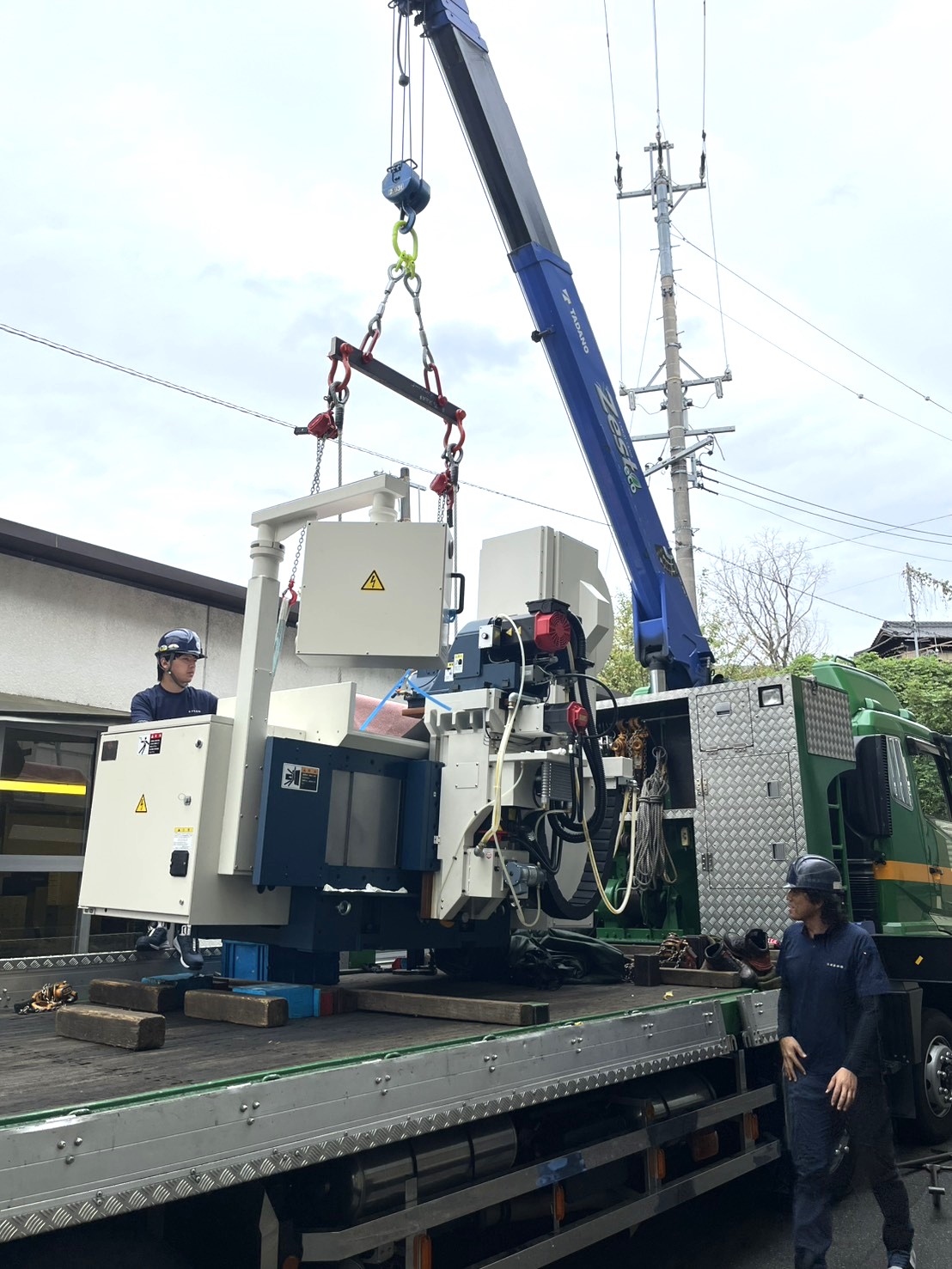 荷降ろし作業自体は問題なく進みましたが、機械のコロ引きによる移動時にわずかな勾配があると進みづらい場面もあり、工夫が必要でした。現場はこれから設備導入を控えており、作業スペースも広く確保されていたため、安全に作業を行うことができました。