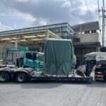 荷降ろし作業自体は問題なく進みましたが、機械のコロ引きによる移動時にわずかな勾配があると進みづらい場面もあり、工夫が必要でした。現場はこれから設備導入を控えており、作業スペースも広く確保されていたため、安全に作業を行うことができました。