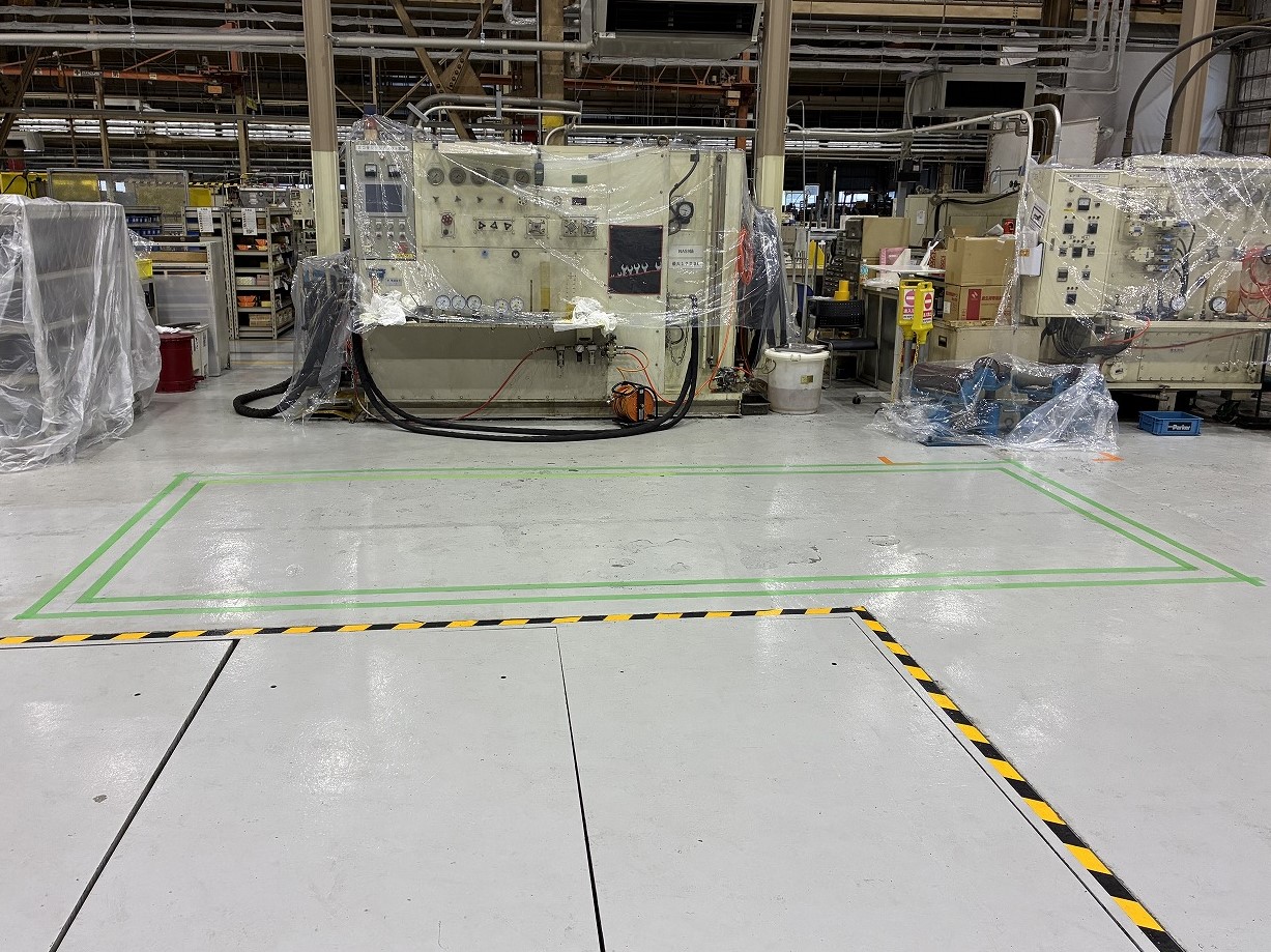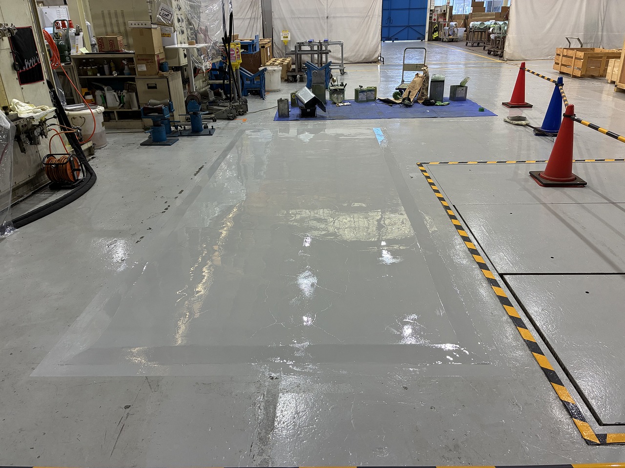 作業場の組立工程で様々な大きさの製品を専用台車に乗せて作業する工程があり、今回施工した範囲の床は長年にわたる重量物の運搬や老朽化により、床が劣化して傷やへこみなどができていました。