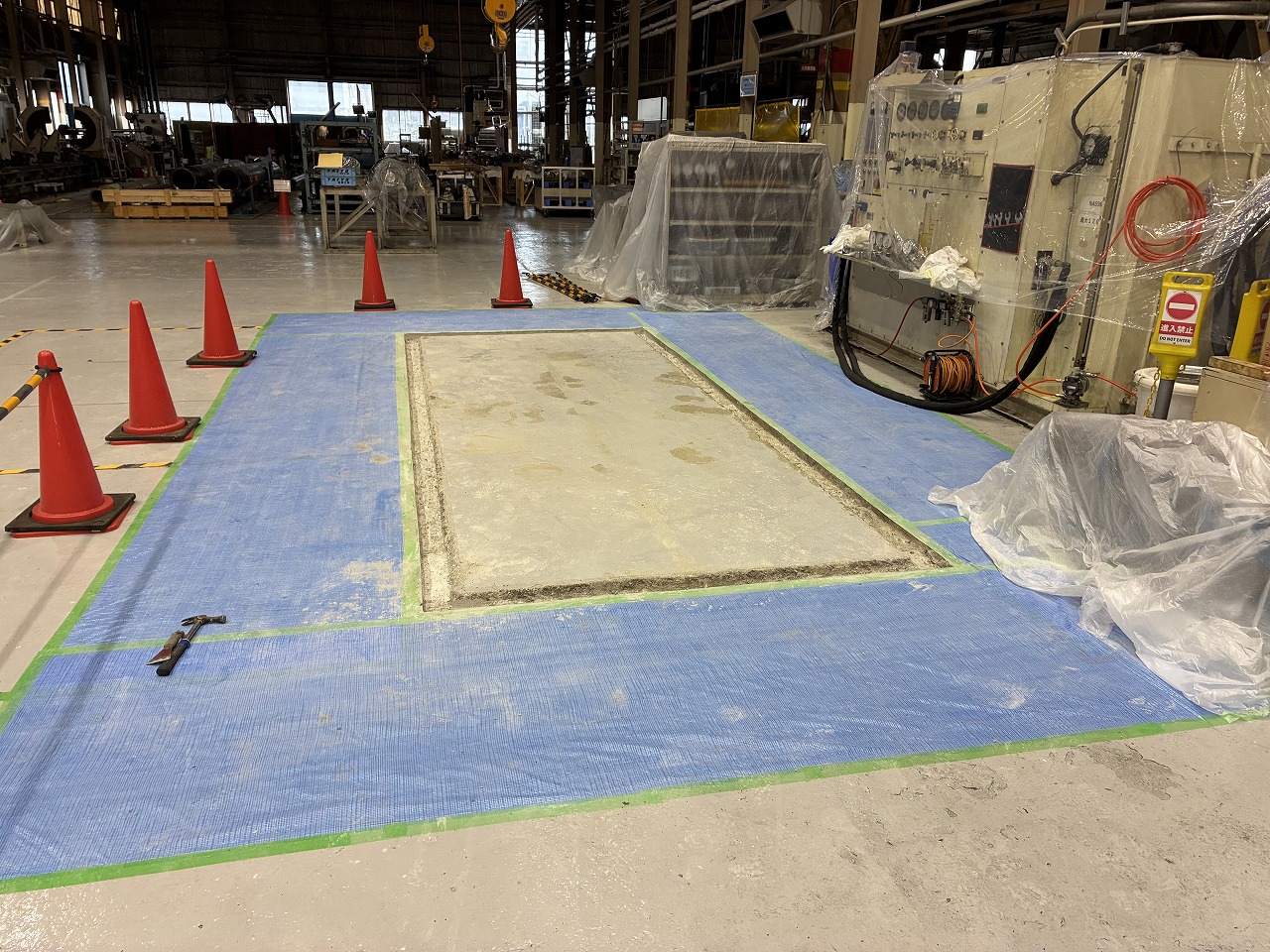 工場が休業日の施工であったため、斫り作業に関しても特に支障はありませんでした。施工の初期段階では、斫り作業の実施とともに新設土間へ樹脂モルタルを塗布し、その後1週間のモルタル乾燥養生期間を設けました。モルタル面の乾燥状態も良好であり、その後の塗床施工においても特に問題なく行えました。