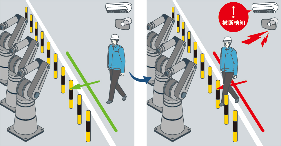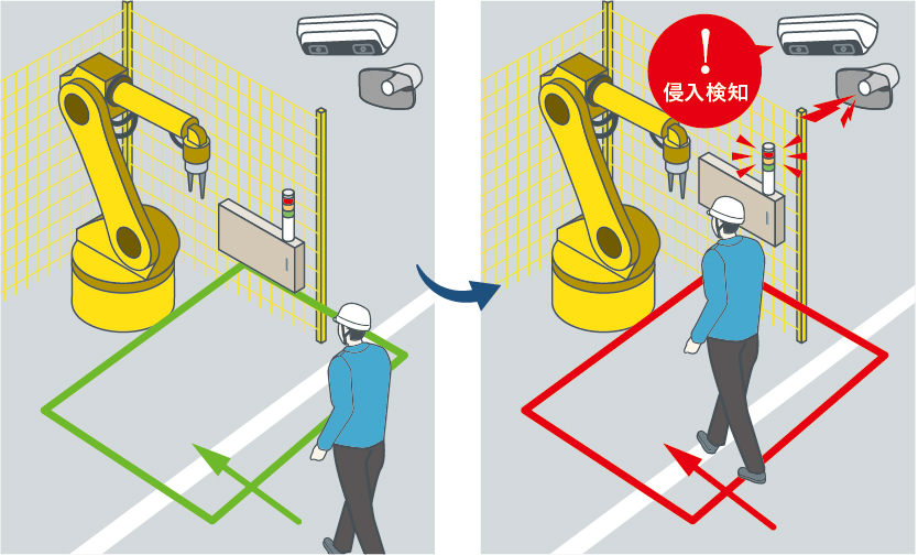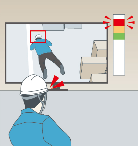 立ち入り禁止エリアや大型機械周辺、ロボット作業エリアなどで
