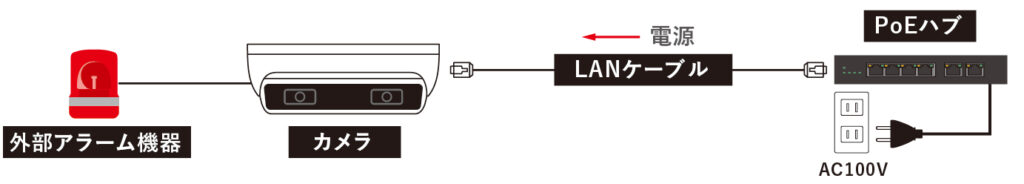事前にPC からカメラに設定をすることで、電源供給用のPoE ハブとカメラ、
