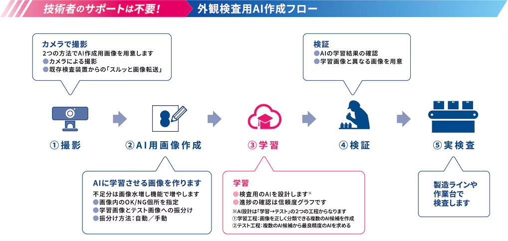 AI学習により高い精度で検出ができます。技術者のサポートは不要です。