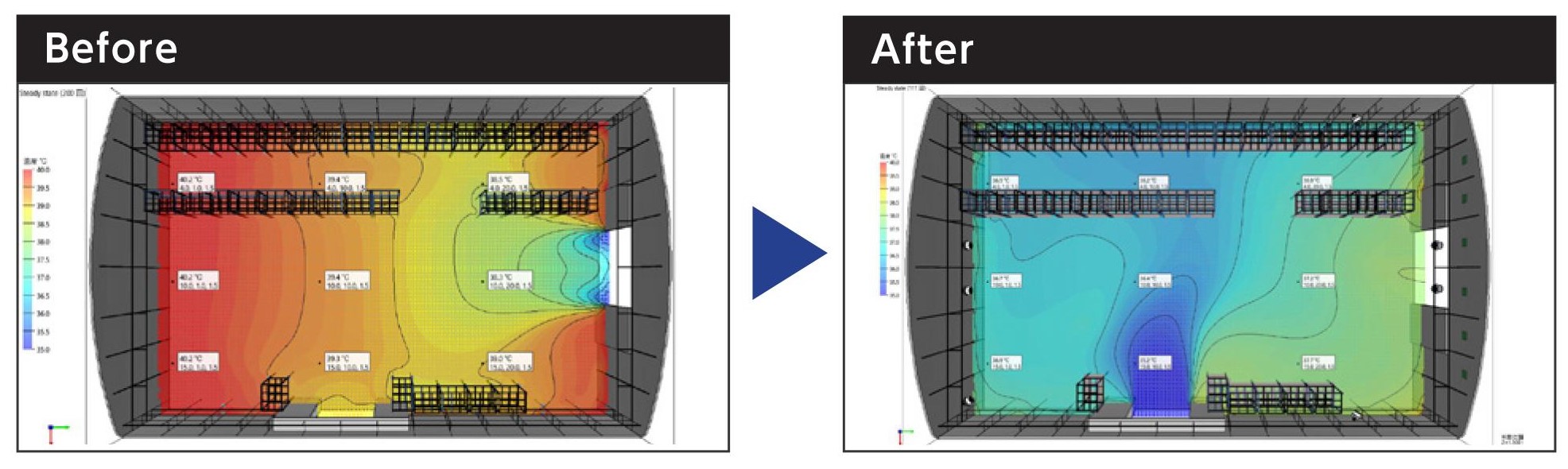 対策前と対策後の気流・粒子分布・温度場を比較して効果を可視化します。