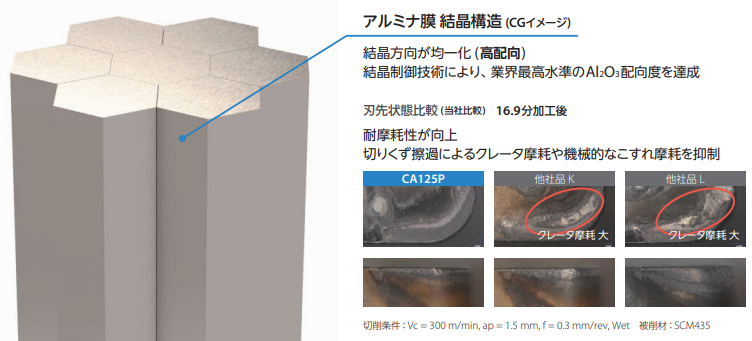 耐摩耗性が向上し、切りくず擦過によるクレーター摩耗や機械的なこすれ摩耗を抑制します。