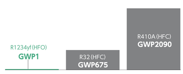 冷媒R1234yfは既存冷媒と比較して地球温暖化係数(GWP)が低く