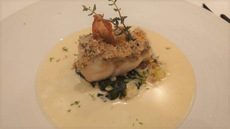 白ワインのソース(ソース・ヴァン・ブラン)と白菜とほうれん草のエチュベの組み合わせも間違いなし。