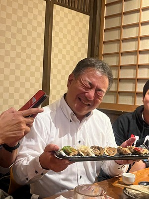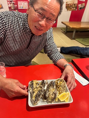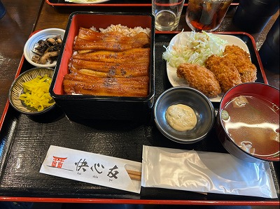 「快心友」さんで昼食。名物のアナゴ飯と、カキフライのセットをいただきました。ふっくらとしたアナゴと甘めのタレが絶妙で、みんな箸が止まらず、自然と笑顔がこぼれていました。