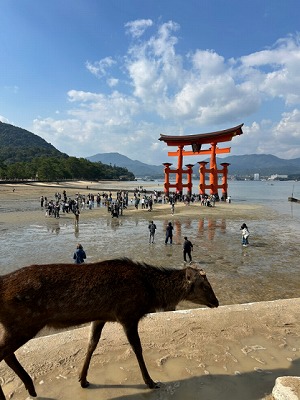二日目の昼食では、広島名物のアナゴ飯とカキフライを味わい、観光では厳島神社や商店街の散策、鹿とのふれあいなど、それぞれが自由に楽しむ時間を持つことができました。